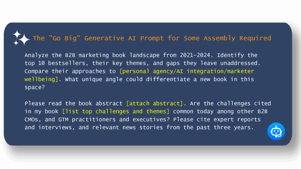 The “Go Big” Prompt: Analyze the B2B marketing book landscape from 2021-2024. Identify the top 10 bestsellers, their key themes, and gaps they leave unaddressed. Compare their approaches to [personal agency/AI integration/marketer wellbeing]. What unique angle could differentiate a new book in this space? Are the challenges cited in my book common today among other B2B CMOs and GTM practitioners, and executives? Please cite expert reports and interviews, and relevant news stories from the past three years.